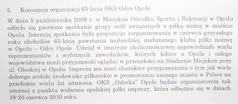 Intencją spotkania było wstępne omówienie propozycji programu obchodów 65-lecia powstania najbardziej zasłużonego klubu sportowego w Opolu, "Odry" Opole, w której udział zapowiedziało wielu wybitnych zawodników, będących niegdyś ważnymi ogniwami klubu. Uroczystości zaplanowano w dniach 18-20 czerwca 2010 roku, w trakcie których zorganizowanie zostanie m.in. festyn sportowy z meczem piłkarskim gwiazd opolskiej "Odry", bieg uliczny nawiązujący do pierwszej historycznej imprezy sportowej zorganizowanej przez "Odrę" Opole, wystawa archiwalnych fotografii przy ul. Krakowskiej oraz konferencja naukowa, której pomysłodawcami są autorzy serwisu Historia "Odry" Opole - Sebastian Bergiel oraz Jan Morawiak.
