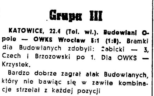 1951: Budowlani Opole – OWKS Wrocław 5:1, OWKS Wrocław – Budowlani Opole 2:1
