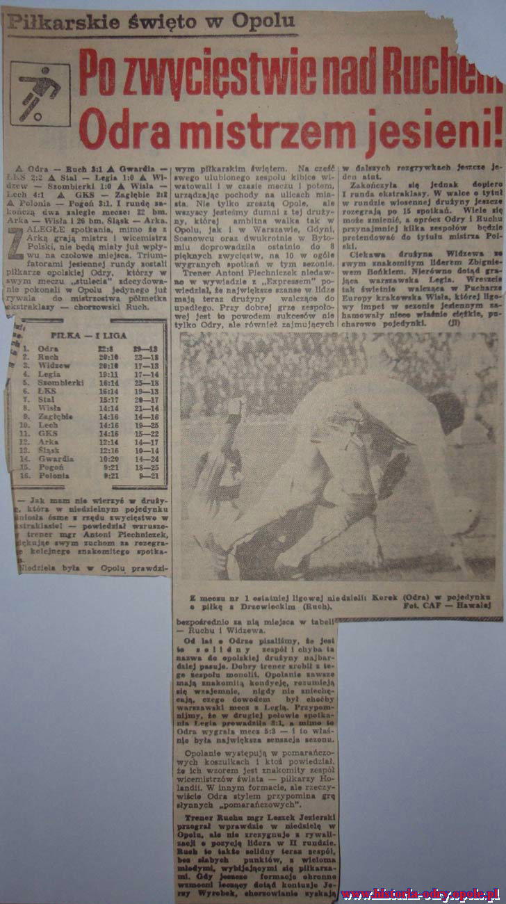 Zwycięstwo dało "Odrze" niewątpliwie ogromny sukces. To właśnie nasz klub był na ustach całej piłkarskiej Polski. To w "Odrze" upatrywano głównego kandydata do zdobycia tytułu mistrza Polski. To w "Odrze" występowali jedni z najlepszych piłkarzy w Polsce, którzy zaledwie po kilku miesiącach zaprzepaścili ogromną szansę, jaka nigdy później już się nie nadarzyła...