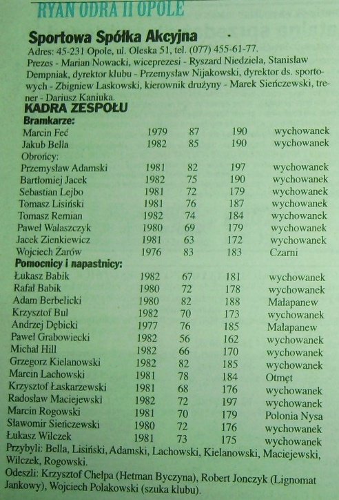 W dniu dzisiejszym przedstawiamy fotografię trzonu ekipy rezerw opolskiej jedenastki na Sezon 2000/2001, która na wyżej zmieszczonym zdjęciu przedstawiała się następująco: