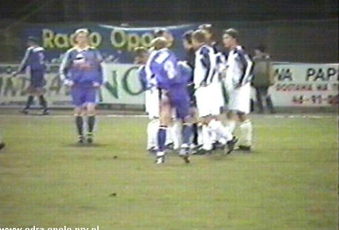 Niestety tuż przed gwizdkiem kończącym pierwszą część spotkania nasz kapitan musiał opuścić boisko ze względu na poważne rozcięcie głowy. W 45 min spotkania czerwony kartonik za faul na Solnicy ujrzał stoper z Płocka Wojnecki czym osłabił swoją drużynę. O dziwo w drugiej części meczu, osłabieni płocczanie stwarzali więcej sytuacji podbramkowych aniżeli "Odra" i dopiero wejście w 56 min Józefa Żymańczyka za Henryka Bałuszyńskiego zmieniło obraz gry. W 59 min gry idealne dośrodkowanie wykorzystuje Dariusz Solnica, który zdobywa drugiego i ostatniego gola w tym spotkaniu. Solnica miał jeszcze okazję do zdobycia kolejnej bramki w 75 min z rzutu karnego, którego niestety nie wykorzystał strzelając prosto w Krupskiego Mimo,że w 90 min spotkania Piotr Plewnia za brutalny faul na zawodniku "Orlenu" został ukarany czerwoną kartką, to wynik nie uległ zmianie i "Odra" pokonała w pierwszym spotkaniu 1/4 finału PP "Orlen" 2:1.
