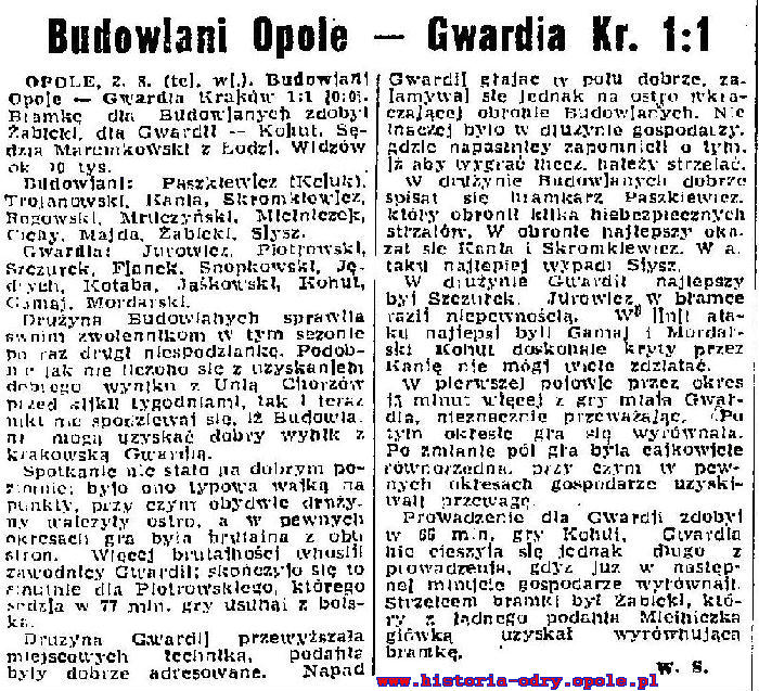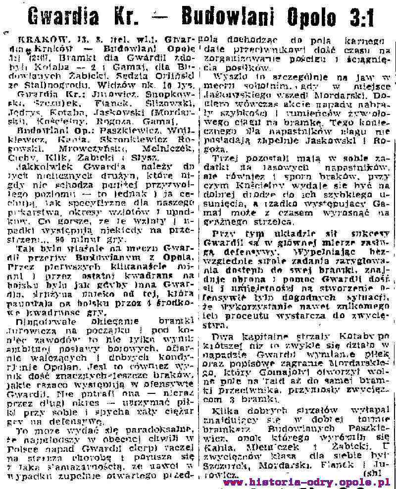 Bilans konfrontacji:1953: Budowlani Opole – Gwardia Kraków 1:1, Gwardia Kraków – Budowlani Opole 3:1